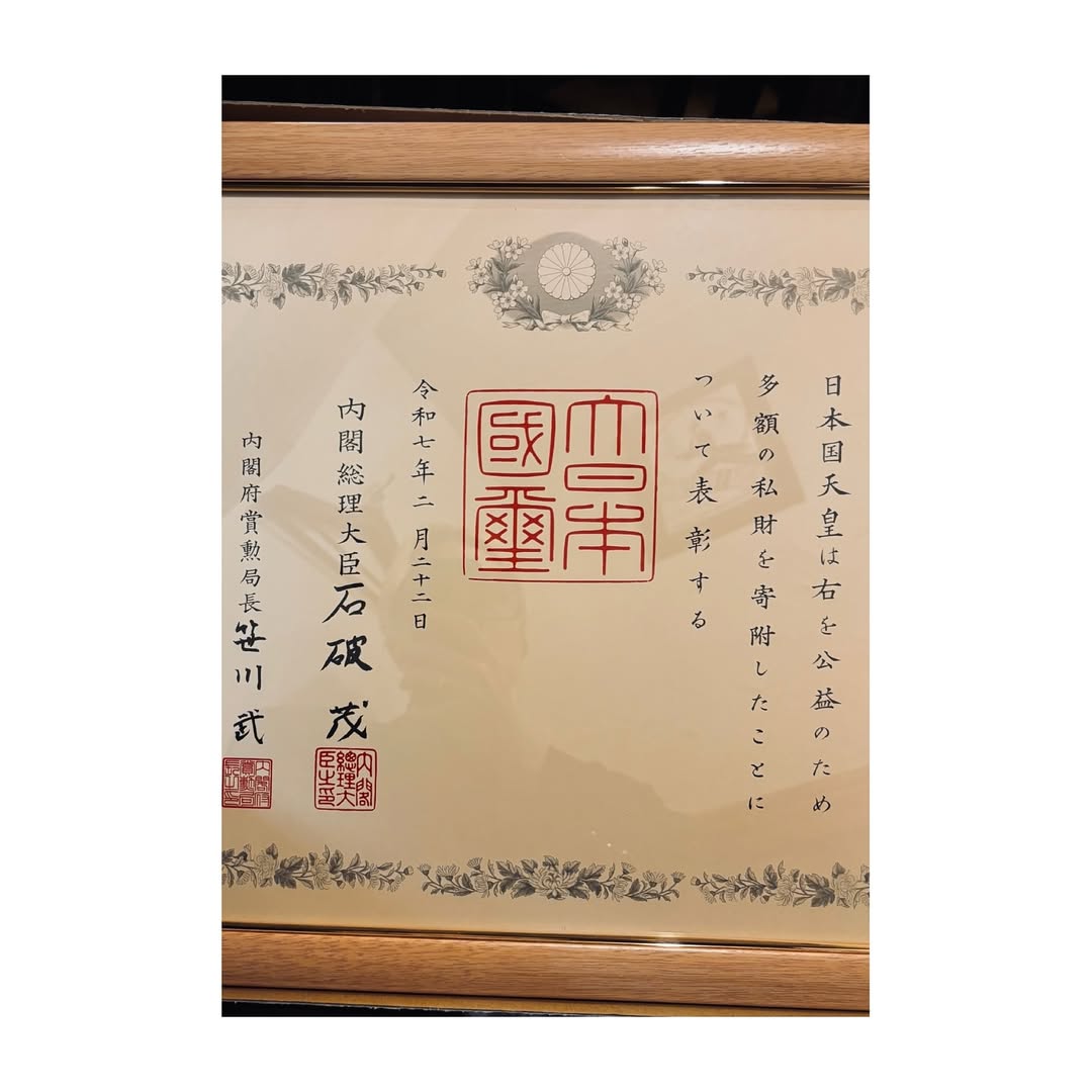 ROLANDさんは「やらない善より、やる偽善 寄付しない常識人より、寄付するホスト」「本日天皇陛下より紺綬褒章を頂きました。」と綴ると、写真をアップ。